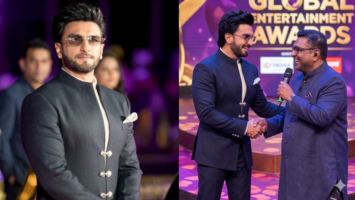 Known for his bold fashion choices, Ranveer opted for a more refined look at the event. He wore a structured navy closed-neck blazer with striking gold buttons over a crisp white shirt, paired with tailored trousers.